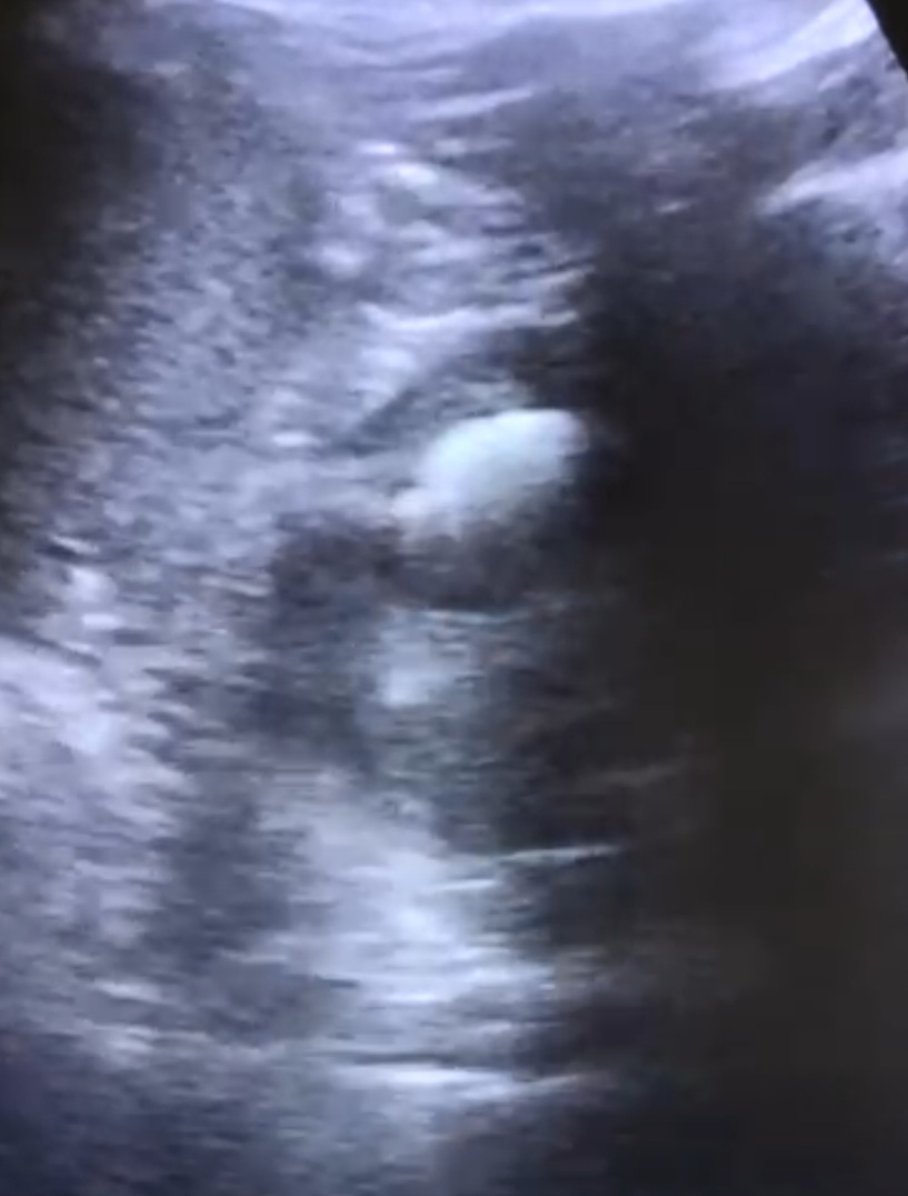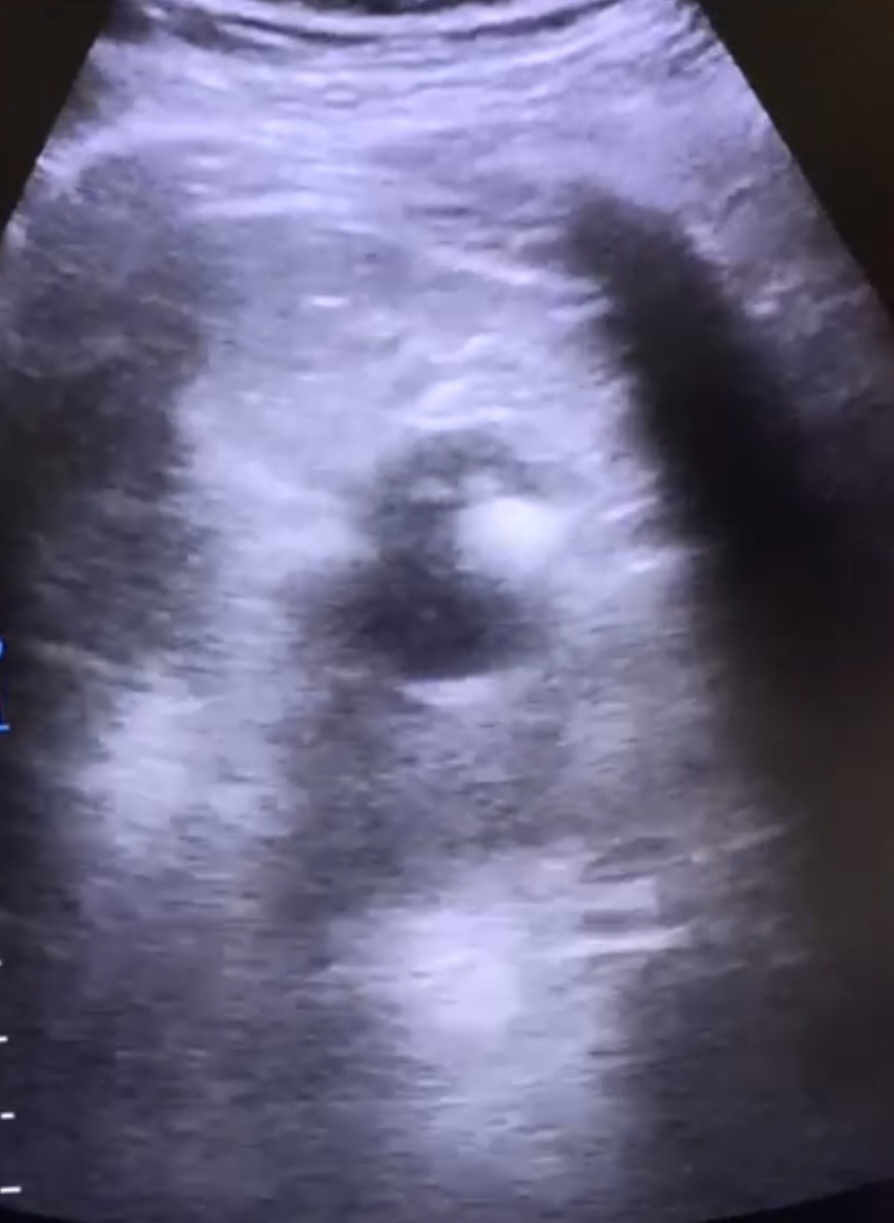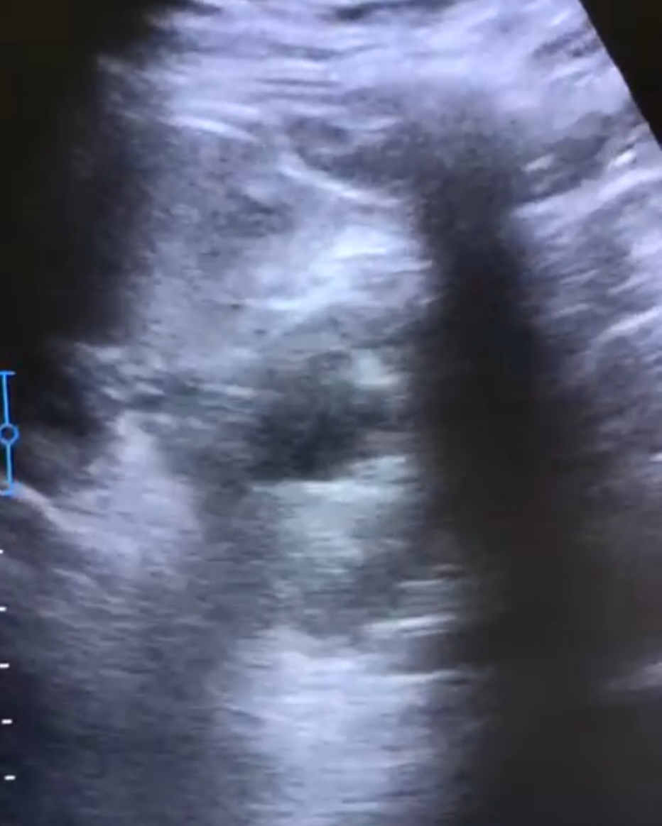 Se solicita TAC para mejor valoración: Quiste en polo superior del riñón izquierdo, con leche cálcica en interior, que comunica con el sistema excretor.