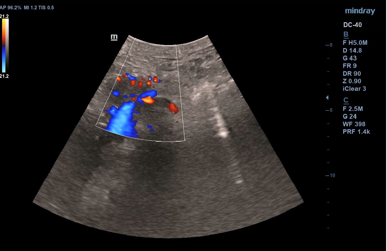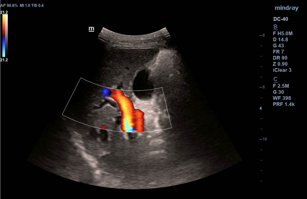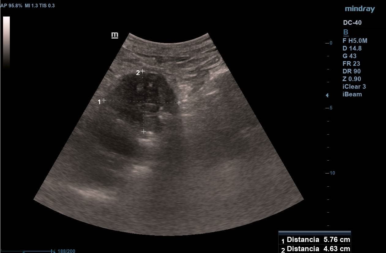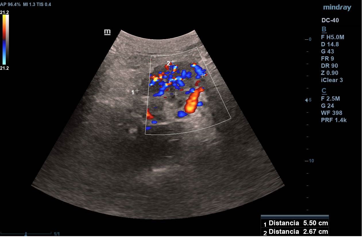 Se realiza ecografía clínica abdominal visualizando en región epigástrica masa de 5,7 x 4,6 cm de aspecto heterogéneo, con un componente principal hipoecogénico y áreas de mayor intensidad. Presenta mapa color positivo y dilatación de colédoco.