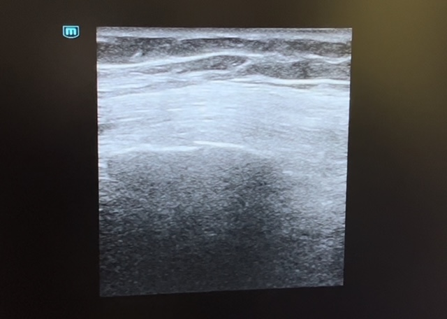 Se evidencia en la ecografía pulmonar sobre el 7º y 8º arco costal izquierdo una posible línea de fractura con falta de contigüidad en los rebordes costales sin evidenciar signos de neumotórax.