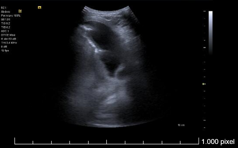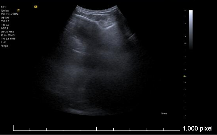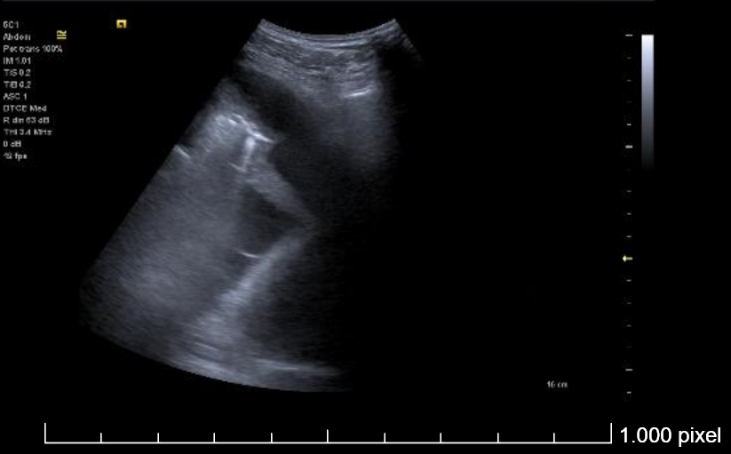 Derrame pleural izquierdo de 4 espacios intercostales, libre, hipoecogénico, sin ecos internos. Lóbulo pulmonar inferior izquierdo con imagen de patrón mixto (Intersticial y consolidación).