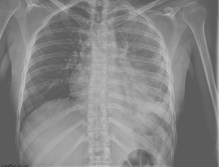 • Rx tórax AP en decúbito supino: Condensación pulmonar parahiliar y paracardíaca izquierda que borra la silueta cardiaca con derrame pleural asociado de menos de 1/3 de dicho hemitórax.