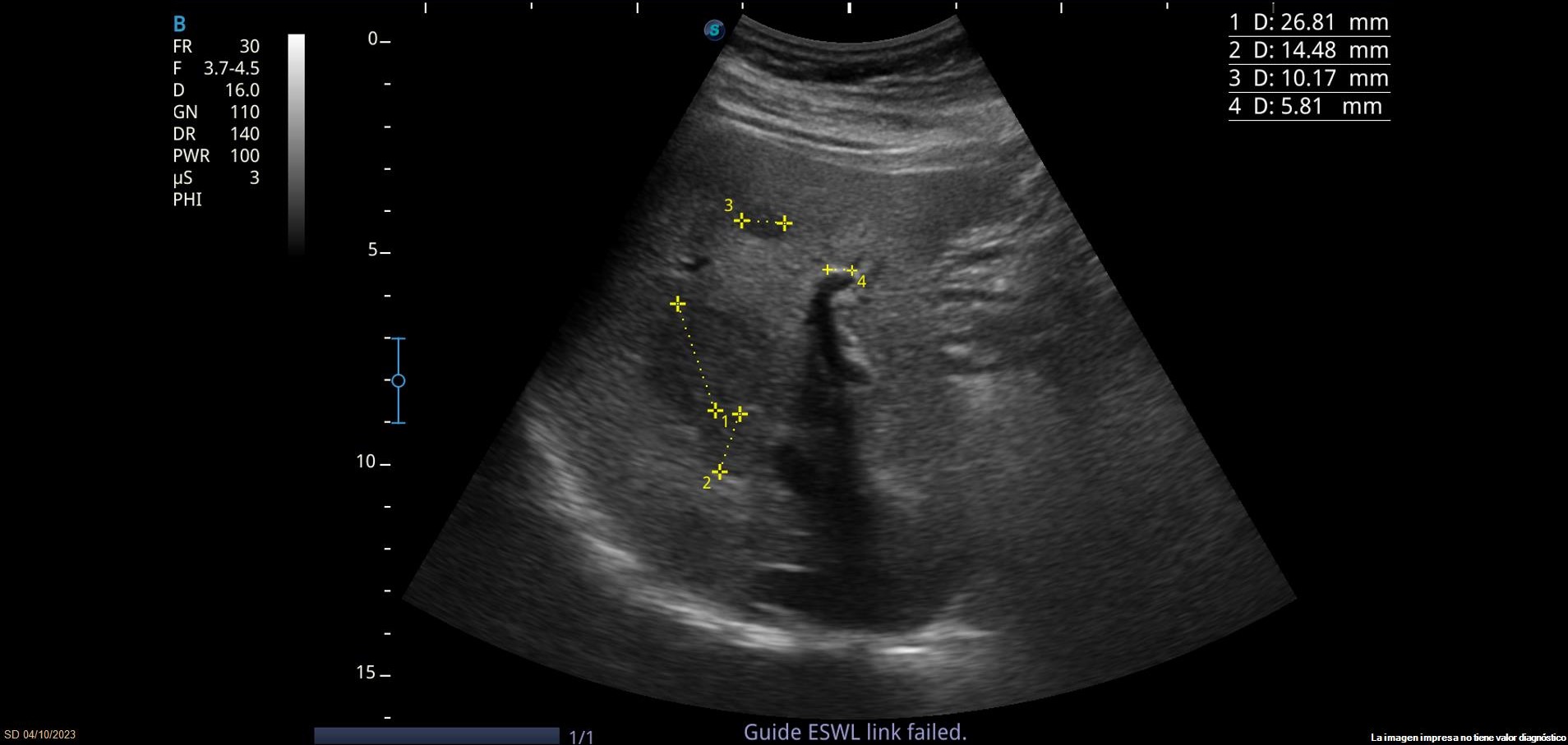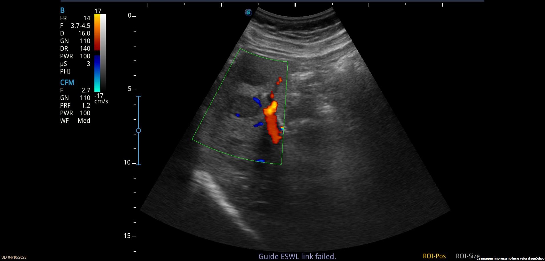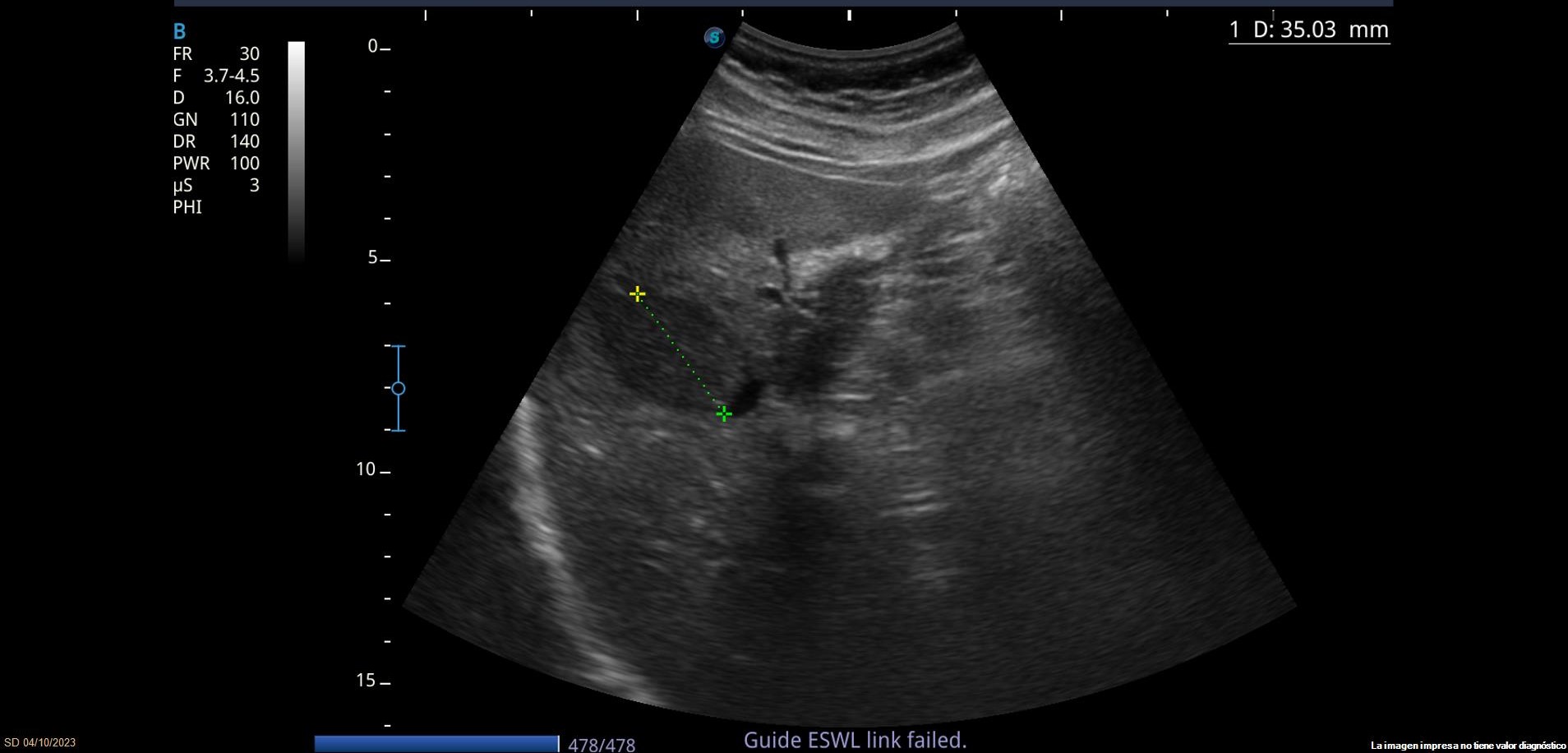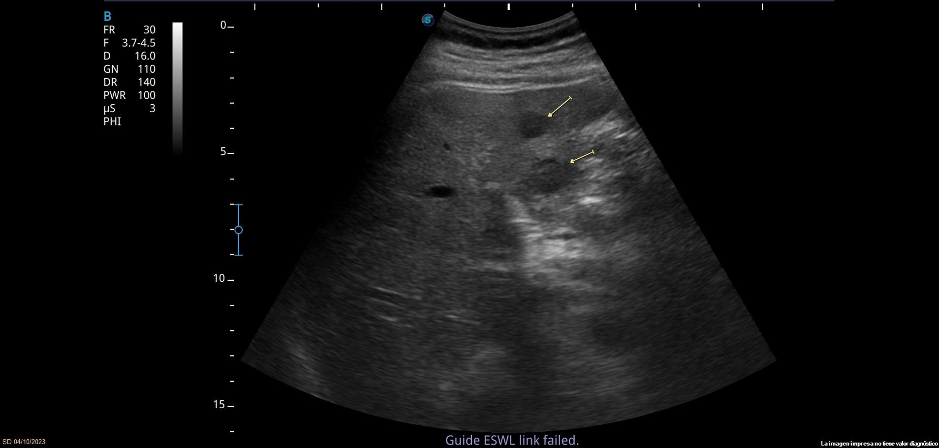 Se observan varias LOEs (lesiones ocupantes de espacio) hepáticas isoecoicas con parénquima hepático, la mayor de 3.5cm de diámetro, con leve vascularización. También se observa lesión hiperecoica con sombra posterior en parénquima hepático, sugerente de litiasis.Pruebas complementarias