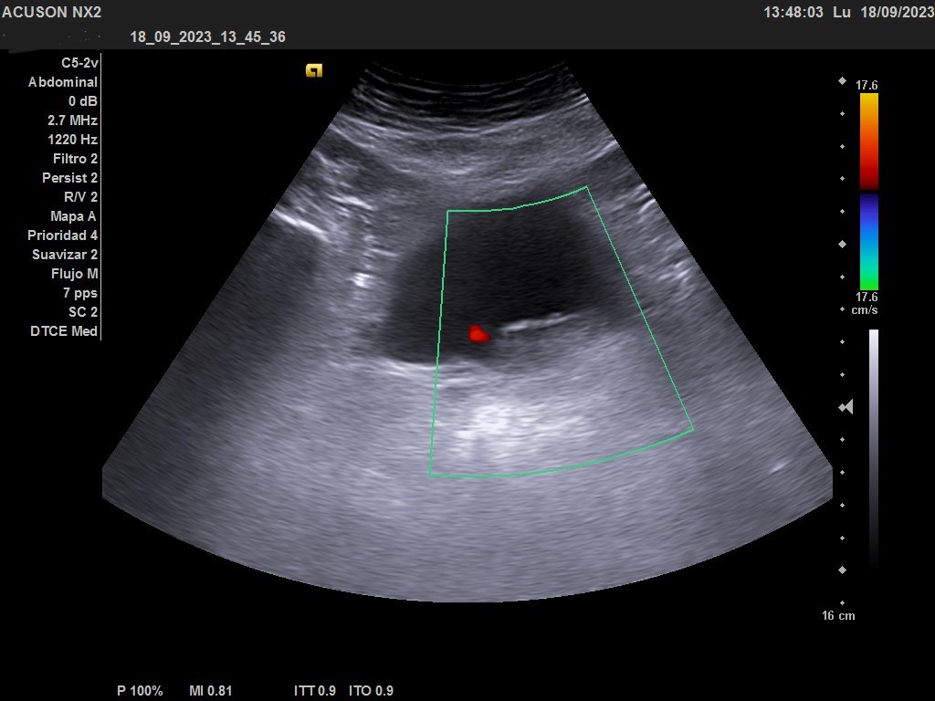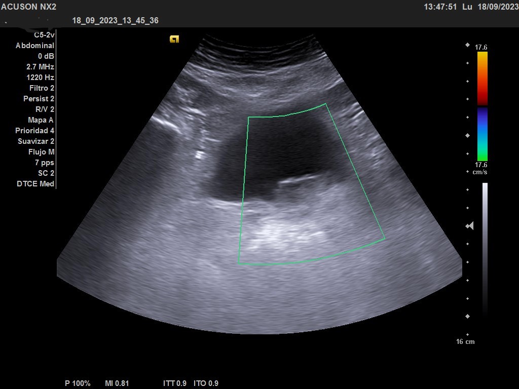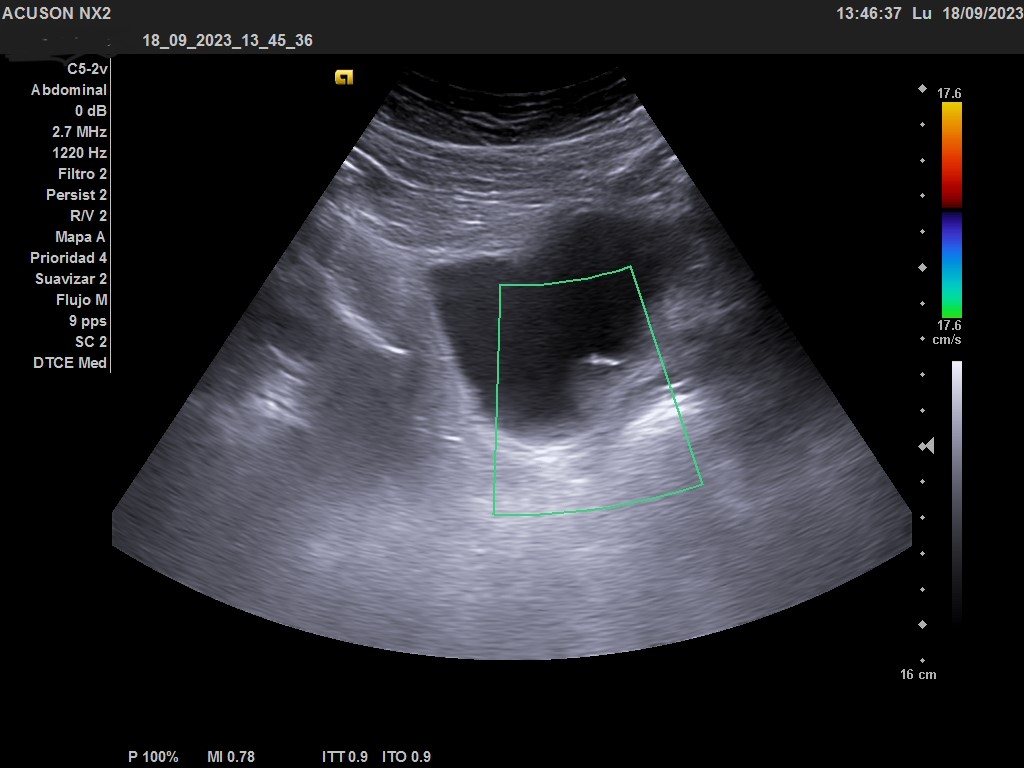 Ecografía clínica urológica: vejiga moderadamente replecionada. Se visualiza en pared posterior imagen hiperecogénica que no capta al Doppler color, de características sospechosas de malignidad. Riñones sin alteraciones en parénquima ni signos de hidronefrosis.