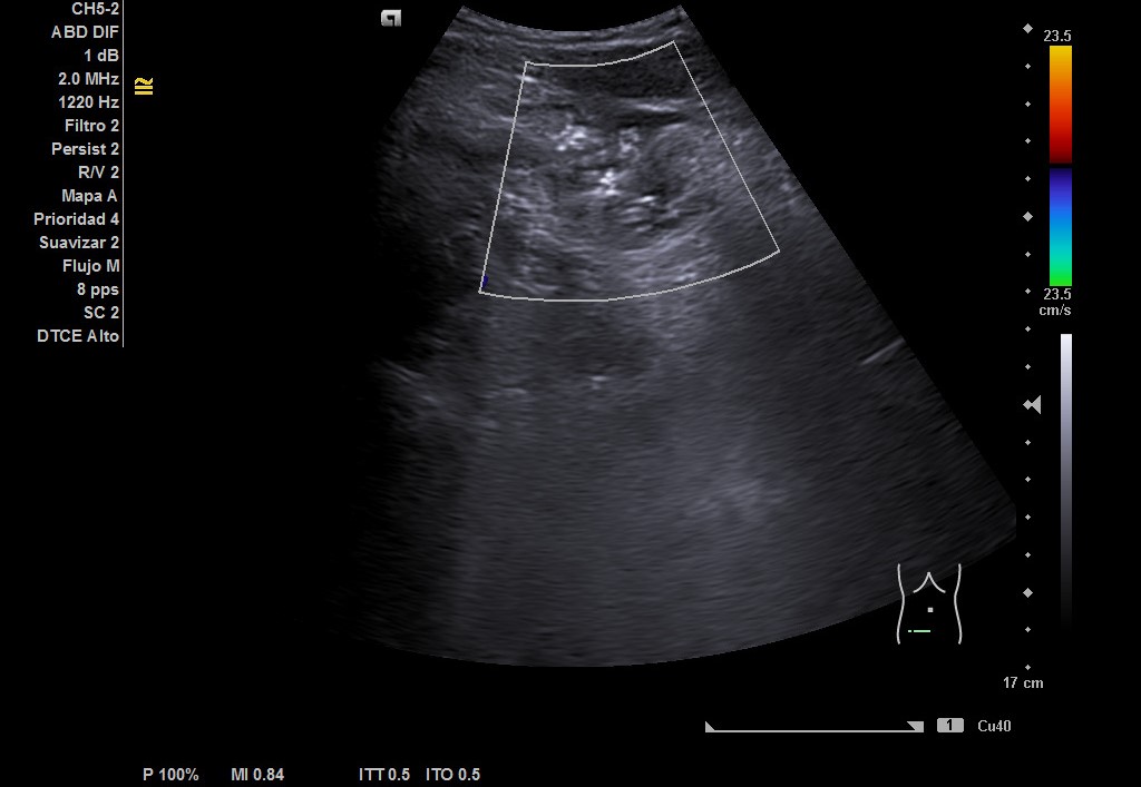 Varón de 31 años, intervenido en el mes previo de apendicitis gangrenosa que precisó drenaje durante 1 semana. Acude por persistencia de disconfort abdominal, asociado a pérdida de 10 kg durante el mes del postoperatorio. Afebril. En la exploración física destaca una FID (fosa iliaca derecha) empastada, dolorosa a la palpación profunda. Ante la clínica, se realiza una analítica y una ecografía programadas para el día siguiente en el Centro de Salud.Hallazgos ecográficos