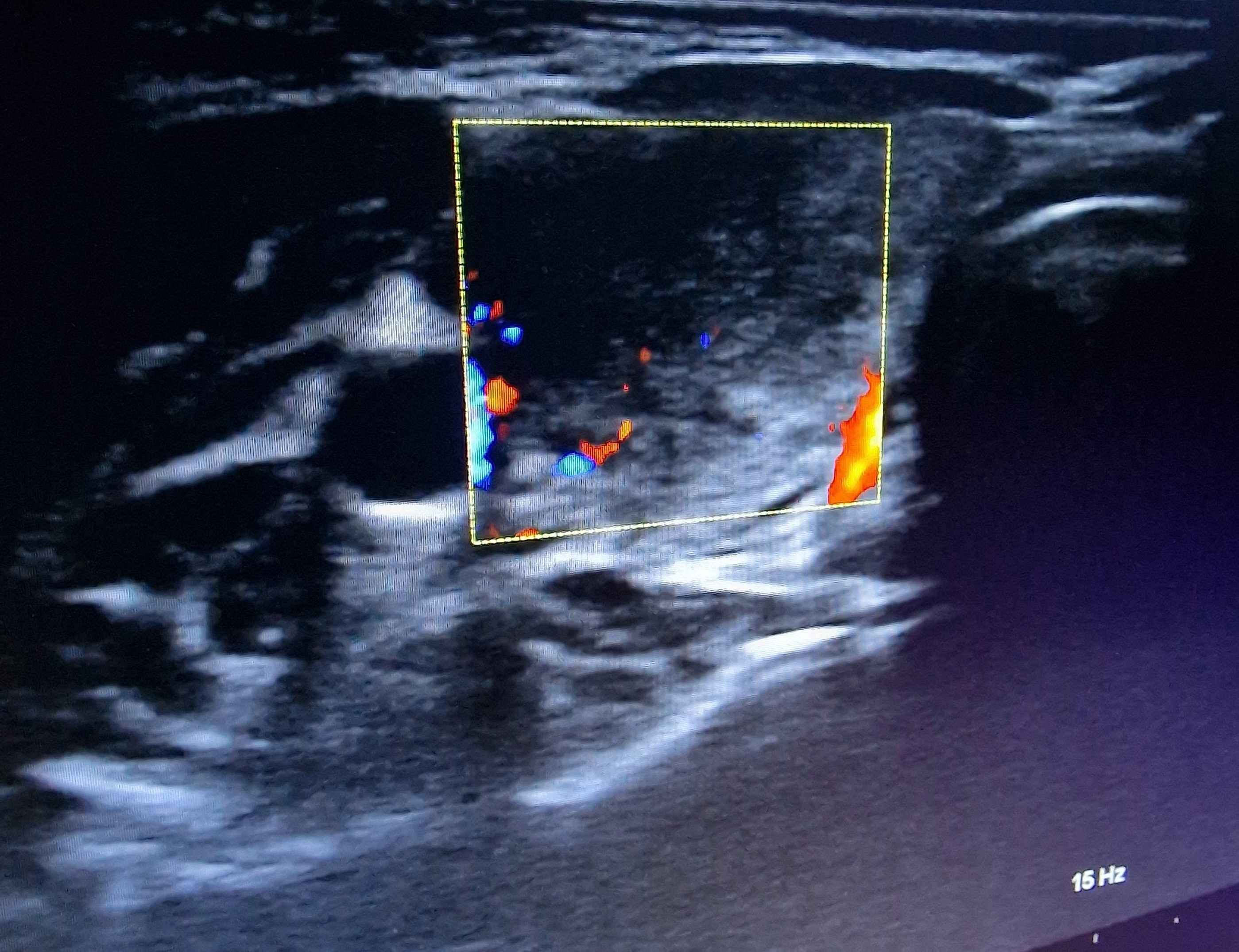Se decide realizar ecografía de cuello ante fiebre sin otro foco, dado dolor cervical anterior, para estudio de posible origen tiroideo.