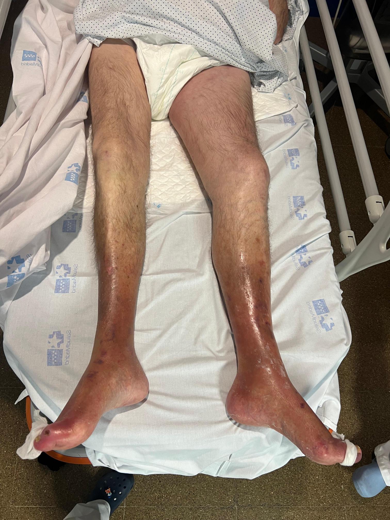 Hombre de 82 años, institucionalizado en residencia, antecedentes de gammapatía monoclonal de significado incierto y portador de prótesis aórtica mecánica, anticoagulado con acenocumarol. Acude a Urgencias por dolor y aumento del diámetro de la pierna izquierda de 2 días de evolución. Además, presenta desde hace meses una lesión cutánea en región glútea ipsilateral, por lo que ha permanecido encamado un mes. Ha tomado correctamente la anticoagulación, pero su hija comenta que con malos controles de INR. Niega disnea, fiebre u otra sintomatología de interés.