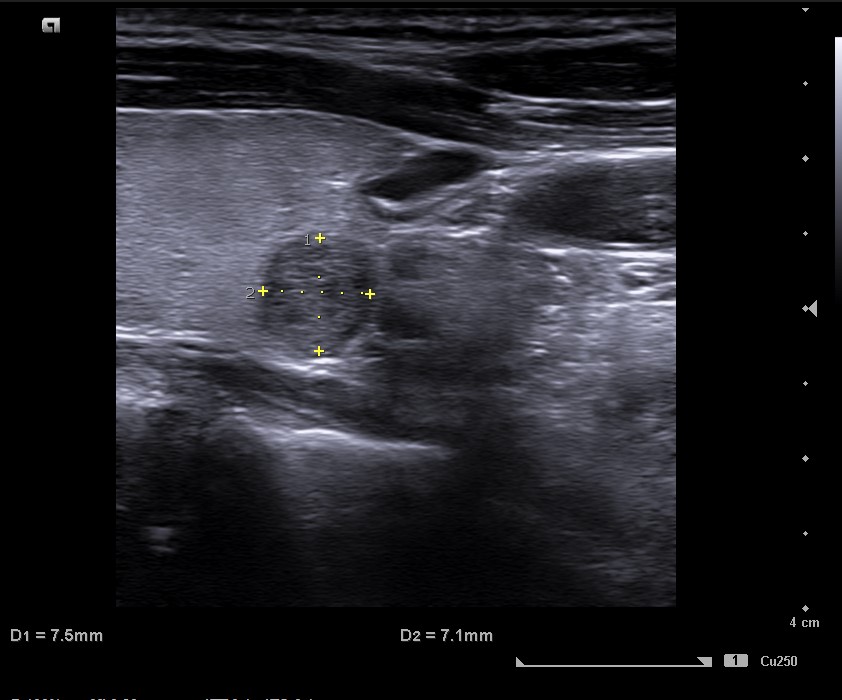 Mujer de 42 años. Acude a consulta refiriendo dolor cervical a la palpación de esternocleidomastoideo derecho de tres meses de evolución. Informe de ecografía privada: lesión mixta, hiperecogénica, sin calcificaciones de unos 7 x 5 x 6 cm, señal de flujo Doppler, TIRADS 2. Adenomegalias inflamatorias benignas adyacentes a glándulas submandibulares.
