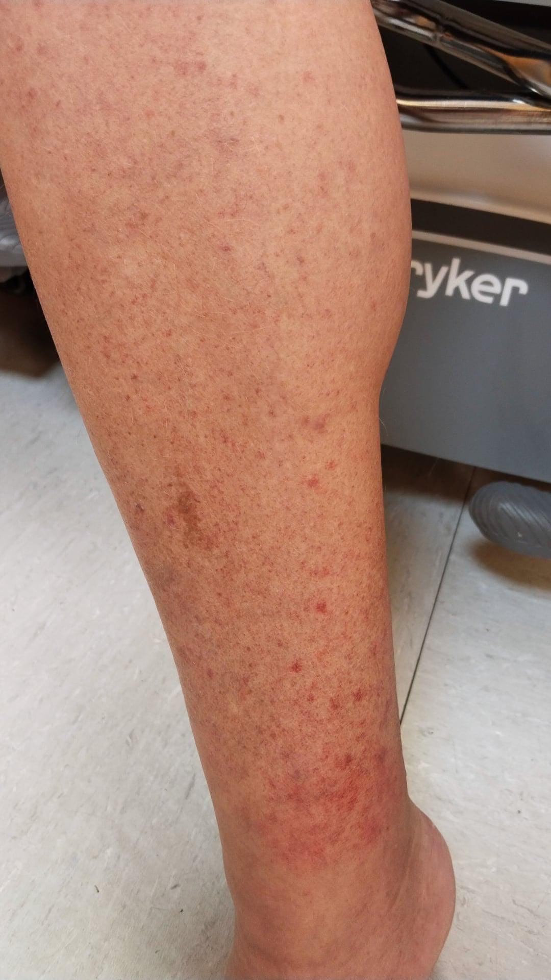 Hombre de 56 años que acude al servicio de urgencias por prurito intenso de una semana de evolución, que asocia una lesión cutánea en forma de petequias en EEII. Asimismo, describe diarrea autolimitada durante 48 horas de evolución la semana pasada.