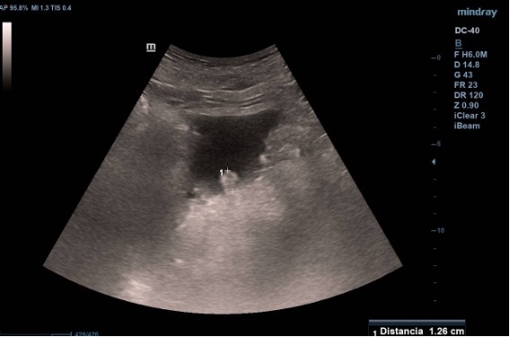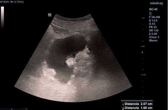 Ecografía vesical: Pared irregular, múltiples lesiones polipoides, la mayor (2.07 cm) en pared posteroinferior. Una lesión polipoiea dependiente de la próstata de 1,6 cm. Otra lesión más craneal en pared posterior de 1.26 cm, y cerca de uréter derecho una de 2 cm. Además, varias lesiones polipoides más pequeñas en cara anterior y lateral derecha.