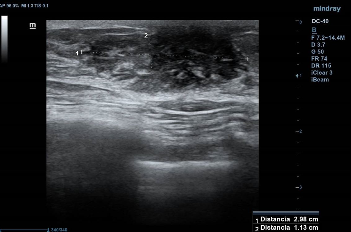 Se realiza ecografía clínica en consulta visualizando tejido de aspecto nodular de 2,98 x 1,13 cm por encima de la capa muscular, con mapa color negativo, compatible con tejido fibroglandular mamario.