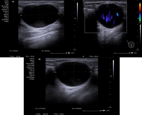 Caso 1: Imagen anecoica de 25 x 30 x 25, que deja refuerzo posterior, sin captar doppler compatible con Quiste mamario.
