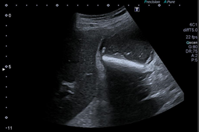 El médico suplente nos comenta el caso, y decidimos realización de Eco abdominal en el momento, sin preparación, para orientar el estudio diagnóstico.