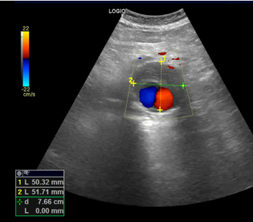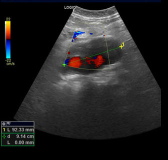 Exploramos con sonda convex en corte longitudinal en epigastrio una imagen ovalada de predominio anecoico de bordes bien delimitados que en corte transverso se extiende longitudinalmente por la linea media de forma ovalada y de diametro mayor a 93,3 mm que presenta contenido hipoecoico en semiluna adherido a pared altamente sugerente de aneurisma aortico con trombo endomural que en algunas zonas ocupa más del 50% de la luz del vaso.