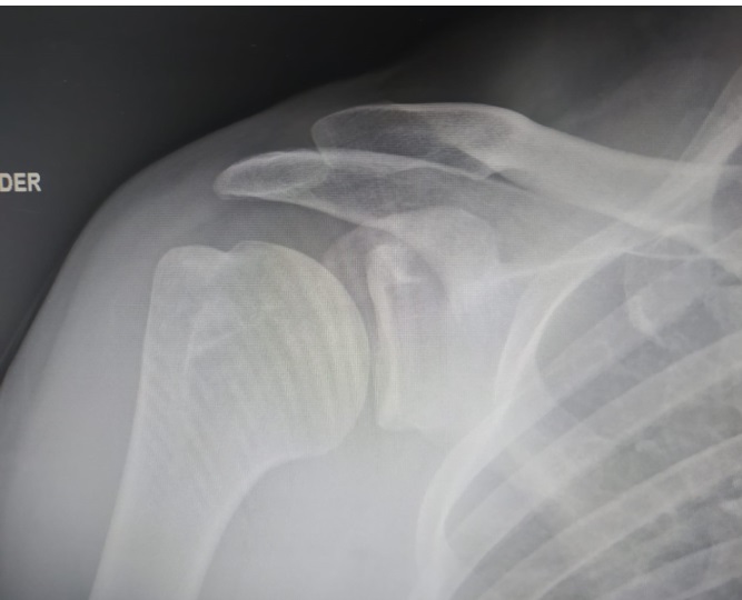 - A la exploración física destacaba dolor a la palpación del espacio subacromial y Test de Gerber positivo (maniobra de despegue de la mano de la espalda: se coloca al paciente con el dorso de su mano en su espalda y se pide que la aleje del cuerpo ejerciendo resistencia), así como limitación en la rotación interna activa del brazo. A la inspección no había deformidades ni hematomas. La movilidad pasiva y el resto de movimientos activos estaban conservados.