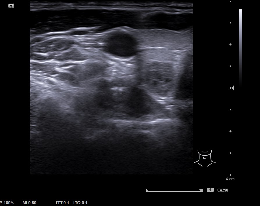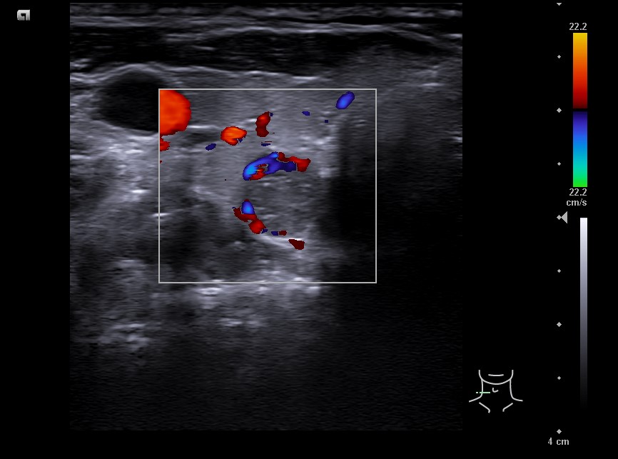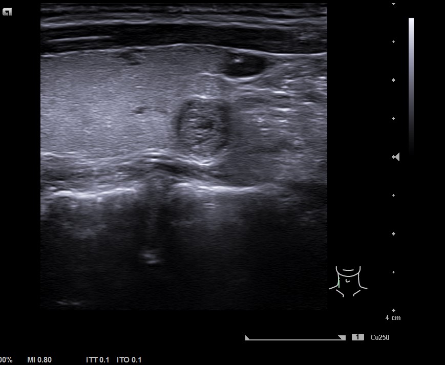Mujer de 42 años. Acude a consulta refiriendo dolor cervical a la palpación de esternocleidomastoideo derecho de tres meses de evolución. Informe de ecografía privada: lesión mixta, hiperecogénica, sin calcificaciones de unos 7 x 5 x 6 cm, señal de flujo Doppler, TIRADS 2. Adenomegalias inflamatorias benignas adyacentes a glándulas submandibulares.
