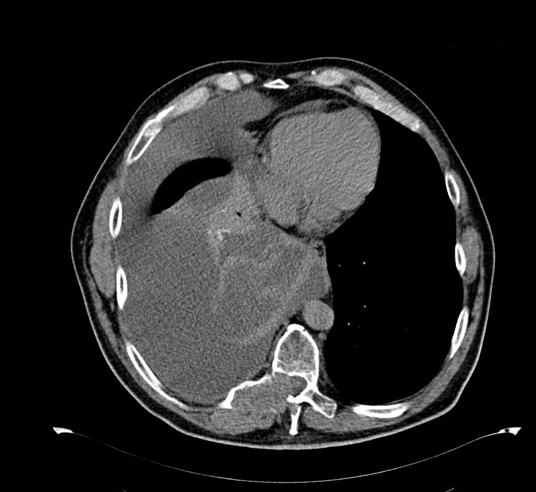 Importante colección anecoica supradiafragmática compatible con derrame pleural masivo (2/3 pulmón derecho), con flóculos ecogénicos (tongue-like sign) sugerentes de parénquima pulmonar atelectásico. Escasa colección anecoica pericárdica. Se identifica en riñón izquierdo una imagen heterogénea de bordes bien definidos en polo superior invadiendo pelvis, de unos 52x58x60 mm, con aumento de captación doppler.Pruebas complementarias